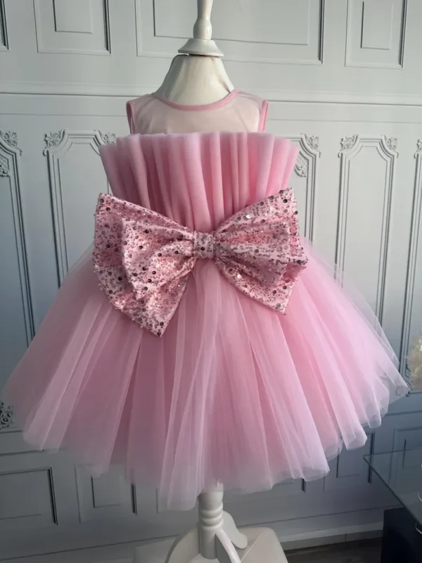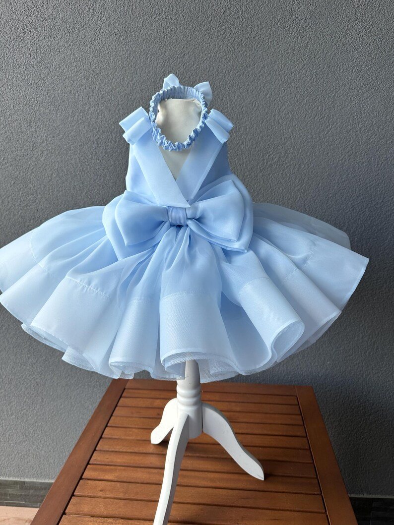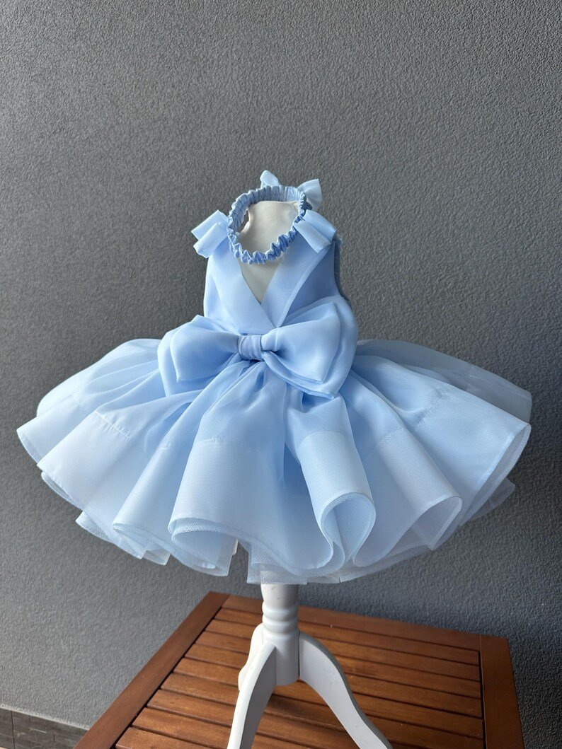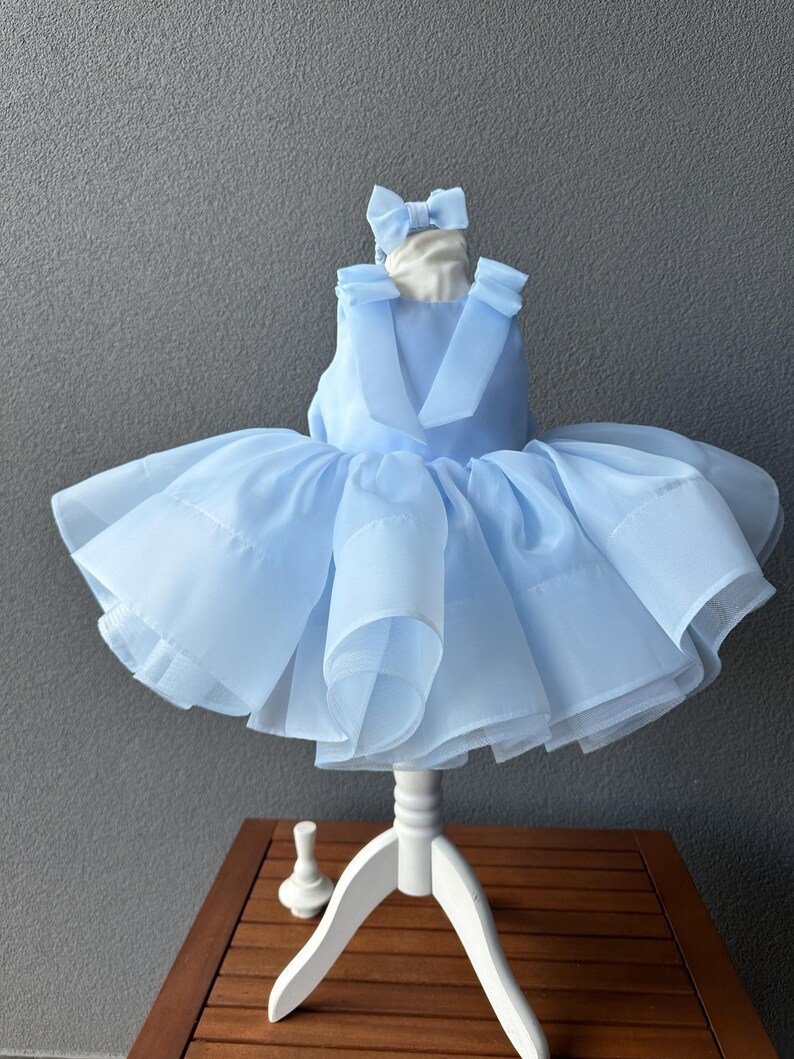 Delicate baby blue frock with elegant ribbon bows on shoulders, giant front bow & dreamy multi-layer tulle skirt. Soft organza, fully lined. Free matching bow headband included. Made-to-measure – perfect for birthday, Eid & princess moments.