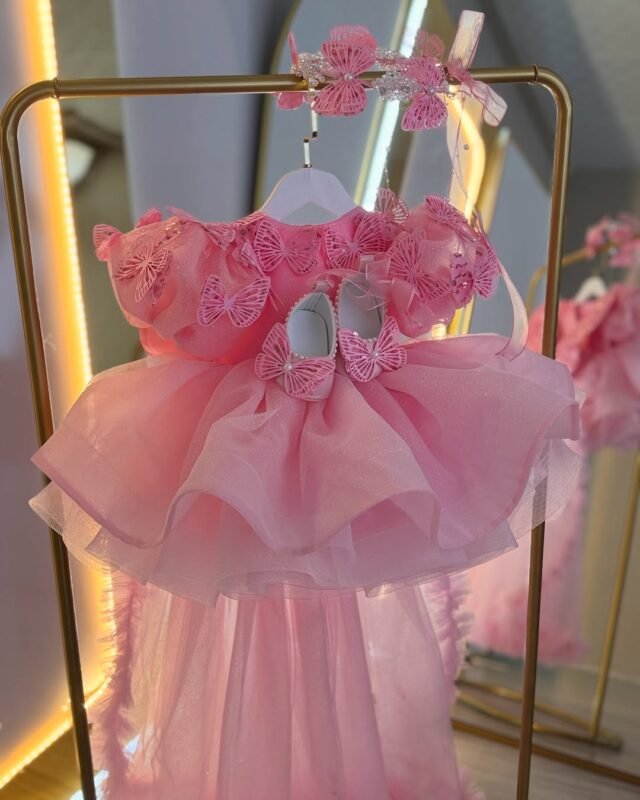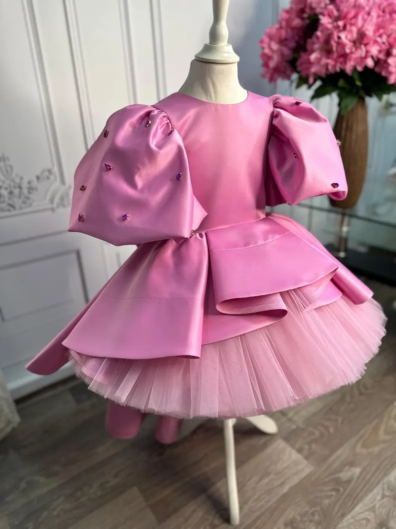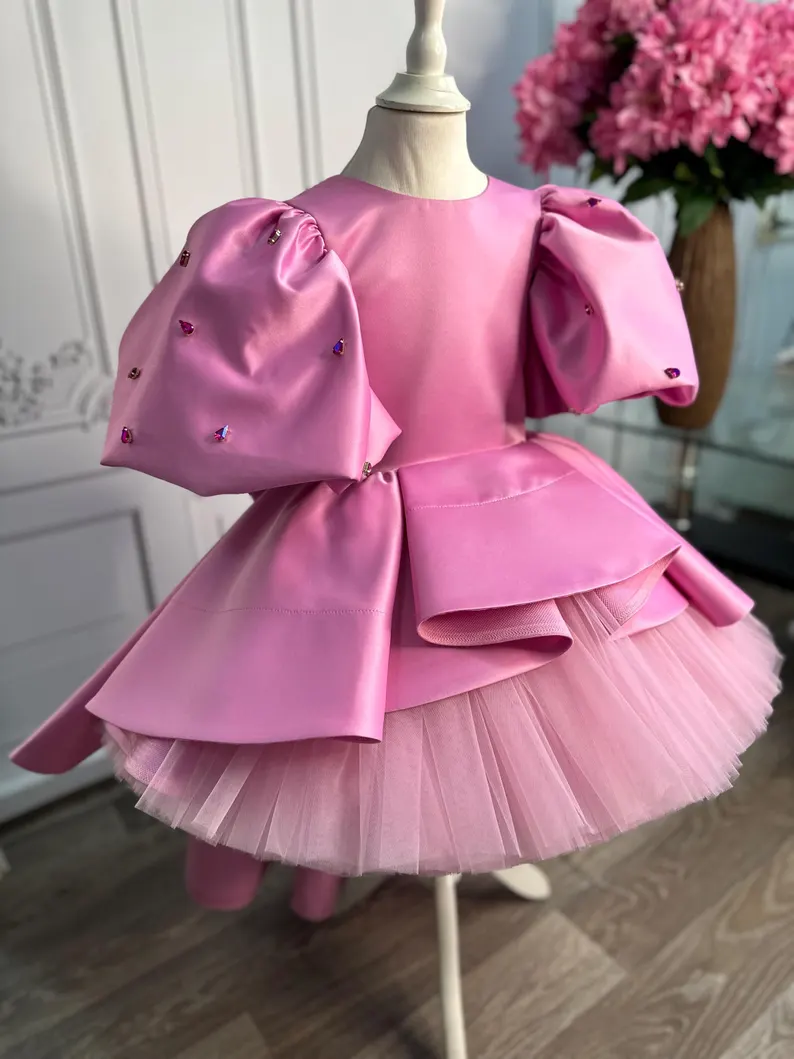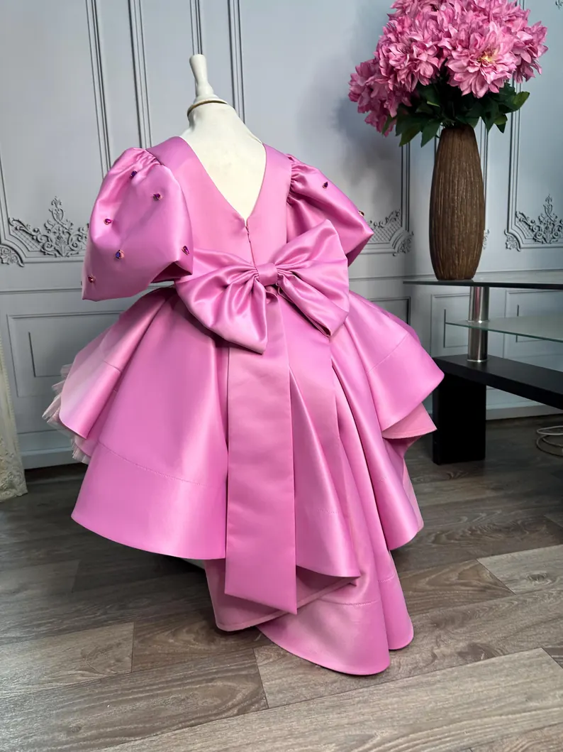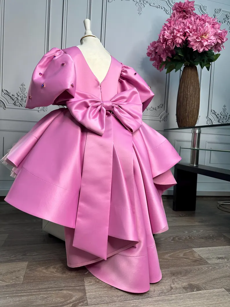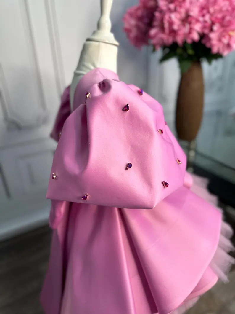 Striking barbie-pink satin frock with dramatic sculptured wing sleeves dotted in crystals, structured peplum & mega back bow. Fluffy tulle skirt, fully lined. Free matching crystal headband included. Made-to-measure – ideal for birthday, Eid & princess photoshoots.