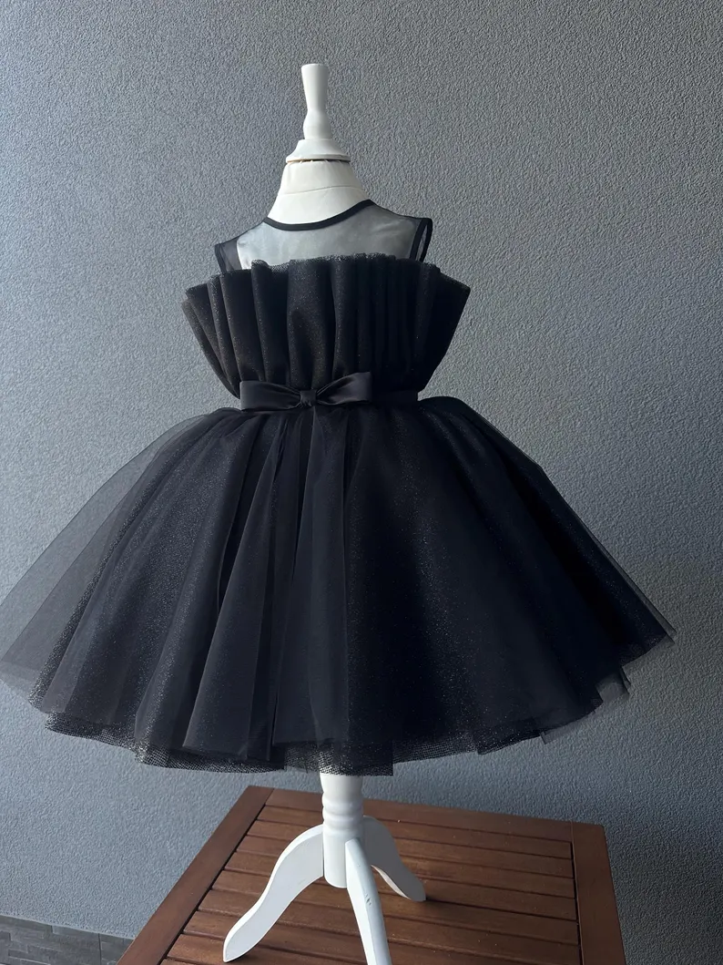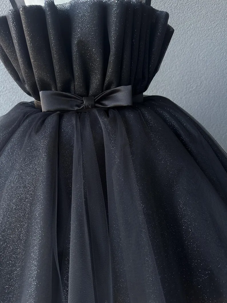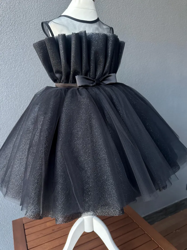 An elegant black glitter princess dress featuring a structured pleated bodice, soft tulle skirt, and statement bow detail — perfect for birthdays, parties, and special evening celebrations.
