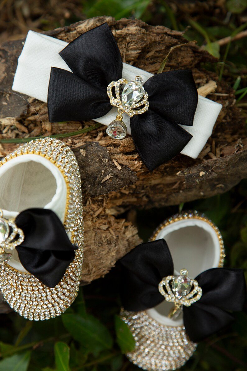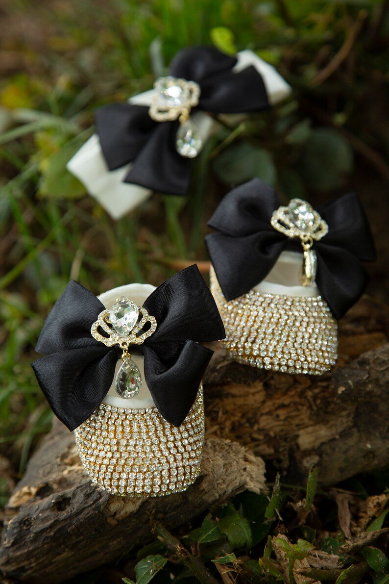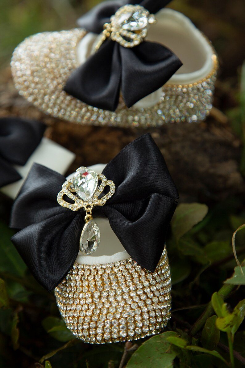 A high-fashion set featuring white soft-sole shoes lavishly studded with gold crystals and topped with chic black satin bows and jewel accents.