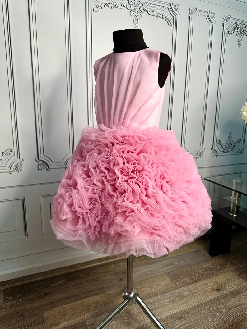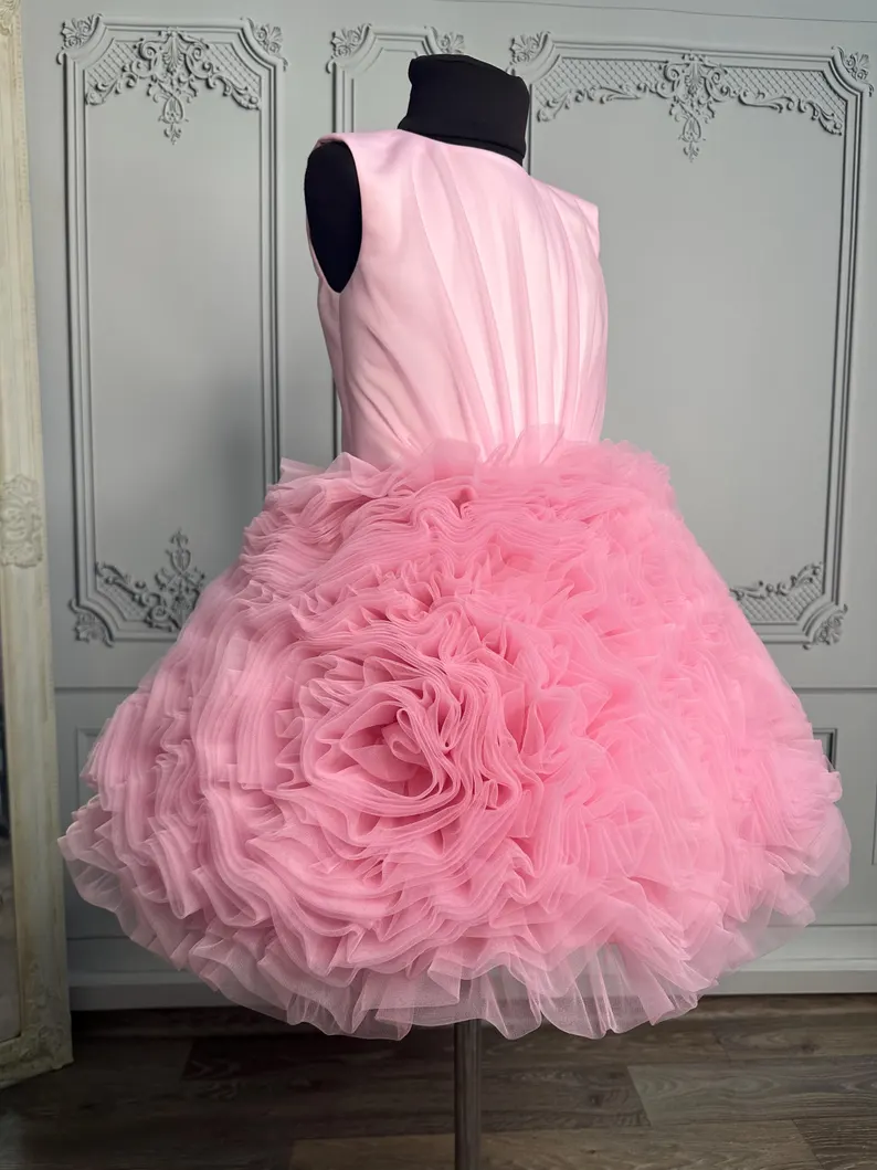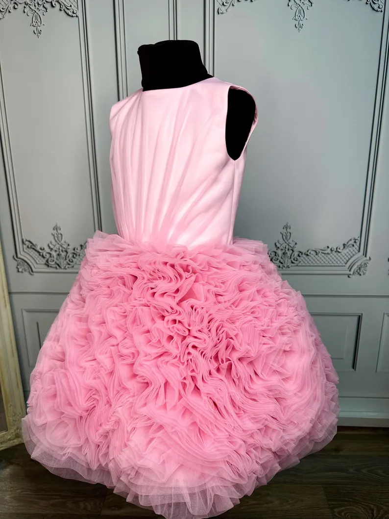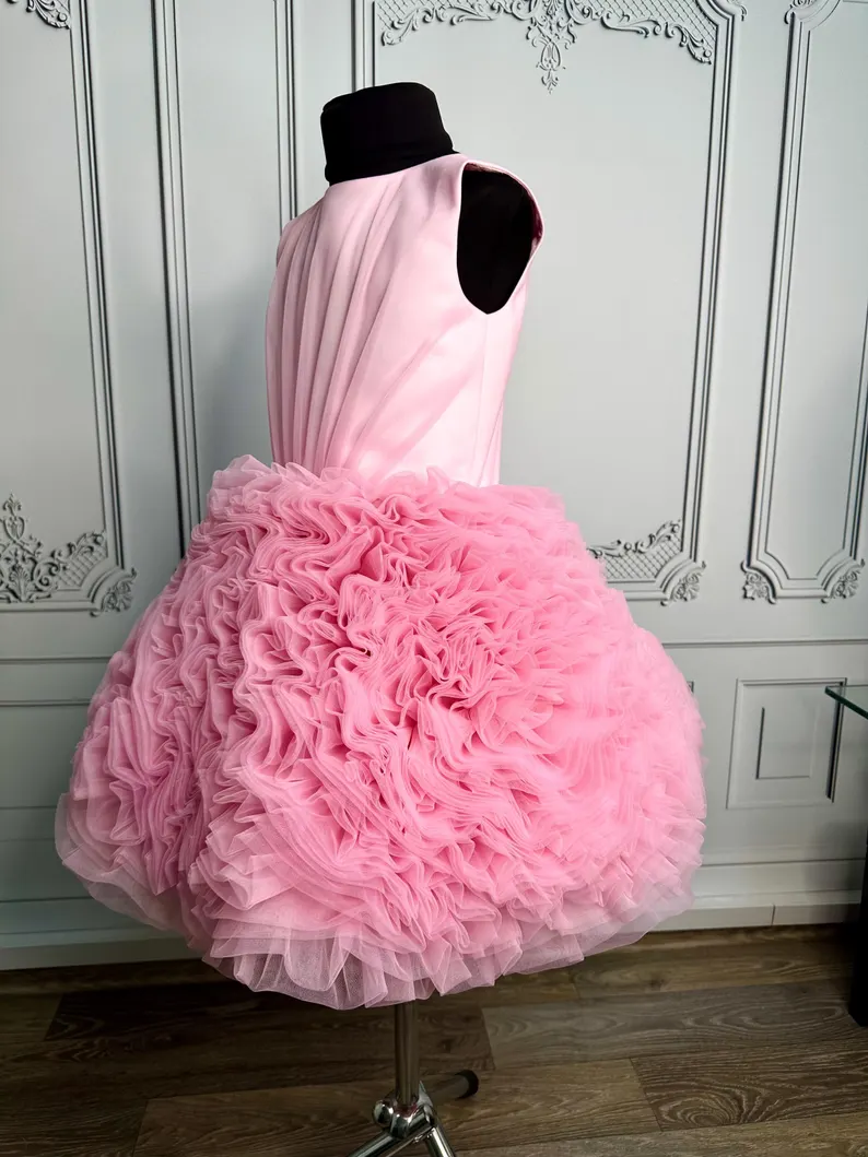 Adorable soft pink sleeveless frock with sleek satin bodice & explosion of dreamy ruffled tulle skirt. Ultra-light, fluffy & fully lined. Free matching pink headband included. Made-to-measure – perfect for birthday, Eid & cake smash photoshoots.