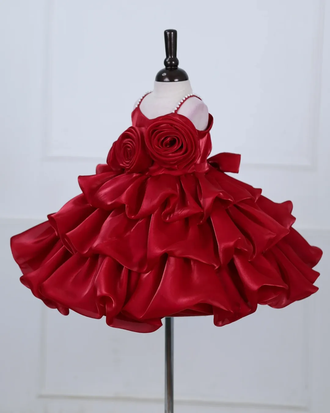 Embodying classic romance and vibrant celebration, this luxurious frock is crafted from high-sheen crimson satin. The design is immediately striking, featuring three beautifully detailed sculpted rose appliqués adorning the bodice. The spaghetti straps are elegantly detailed with a line of small white pearls, adding a refined touch. The show-stopping skirt is composed of many layers of gathered, voluminous satin ruffles, creating a full, bouncy, and memorable silhouette. This gorgeous dress is the perfect choice for Christmas parties, formal birthdays, festive photoshoots, or any occasion demanding bold color and dramatic elegance.