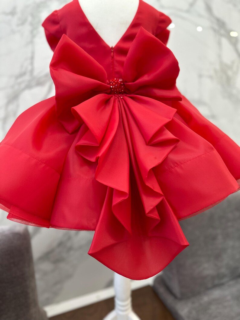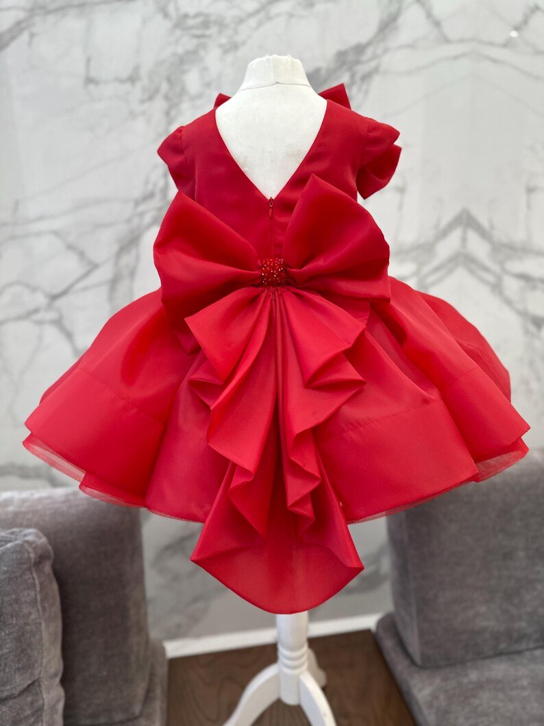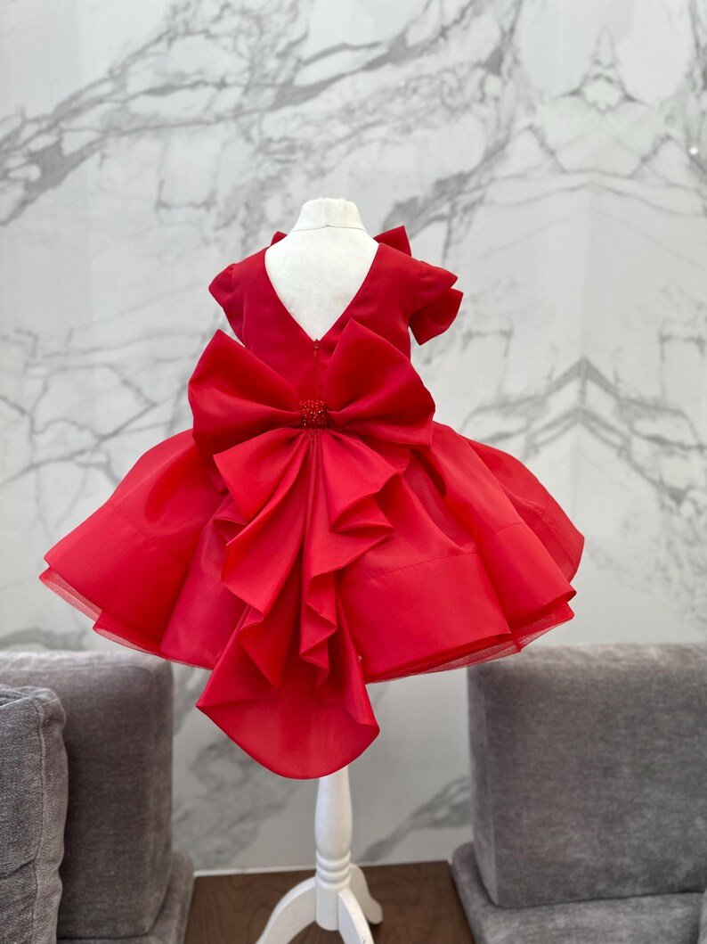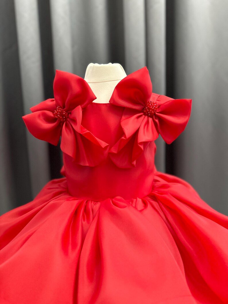 Vibrant red satin masterpiece with oversized shoulder bows, dramatic trailing back bow & ultra-fluffy layered skirt. Rich, soft & fully lined. Free matching red bow headband included. Made-to-measure for birthdays, Eid & special celebrations.