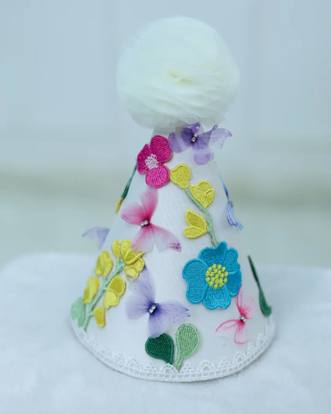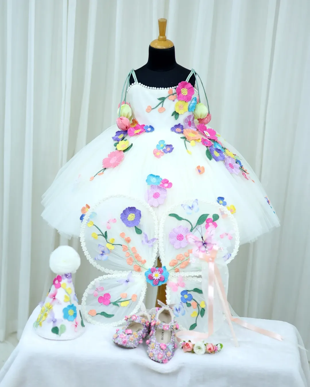 This “Enchanted Butterfly” dress is a true work of art for any special occasion. The dress is crafted on a premium white tulle base, adorned with an explosion of colorful 3D handcrafted flowers in pink, blue, yellow, and purple across the bodice and skirt. It features delicate green spaghetti straps and a sophisticated pearl trim along the neckline for a touch of elegance. The standout feature is the large, detachable butterfly-wing cape at the back, which is also embellished with matching floral embroidery. This set comes complete with a matching floral crown, a party hat, and floral-embellished shoes, making it the perfect choice for high-end birthdays and fairy-themed photoshoots.