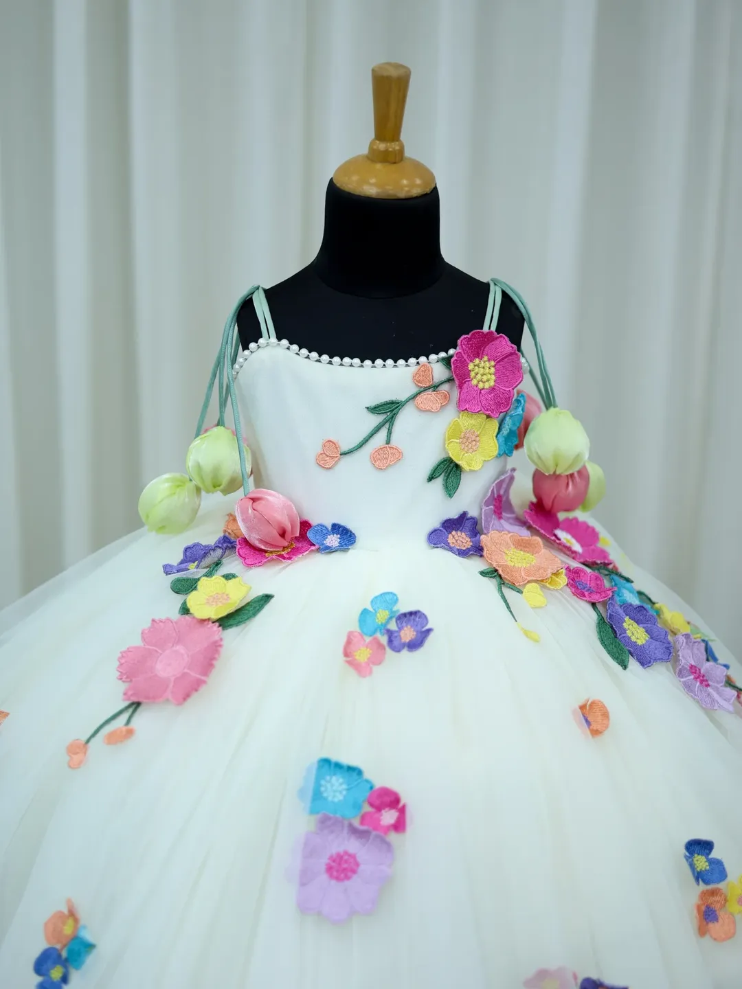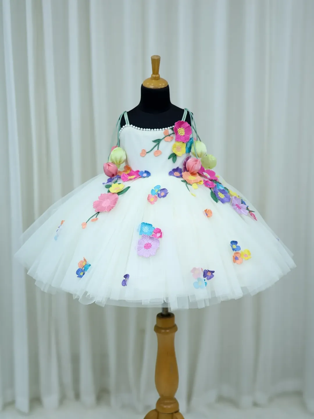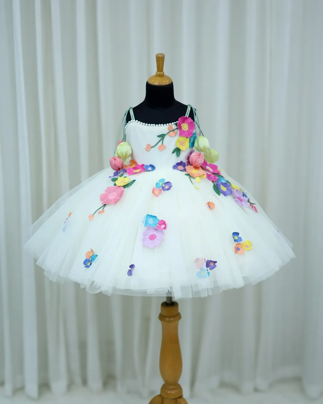 A whimsical white party dress featuring vibrant 3D floral appliqués, a pearl-trimmed neckline, and magical butterfly-wing detailing.