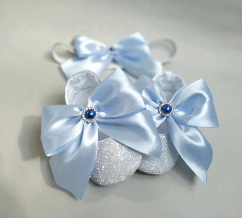 - Satin Bows: Each bootie is adorned with an oversized, soft satin bow in a beautiful sky blue color.