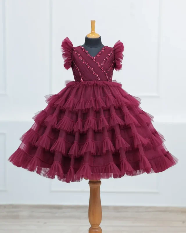 Float through any celebration in this light and lovely dress, crafted from soft, airy purple organza. The elegant puff sleeves and bodice are sweetly decorated with 3D floral appliqués, each centered with a tiny faux pearl, adding a delicate shimmer. The voluminous, tiered skirt provides a beautiful bounce and movement. Lightweight and exquisitely detailed, this frock, complete with a matching organza bow headband, is the epitome of gentle elegance, making it perfect for first birthdays, Easter, family photoshoots, or spring/summer parties.