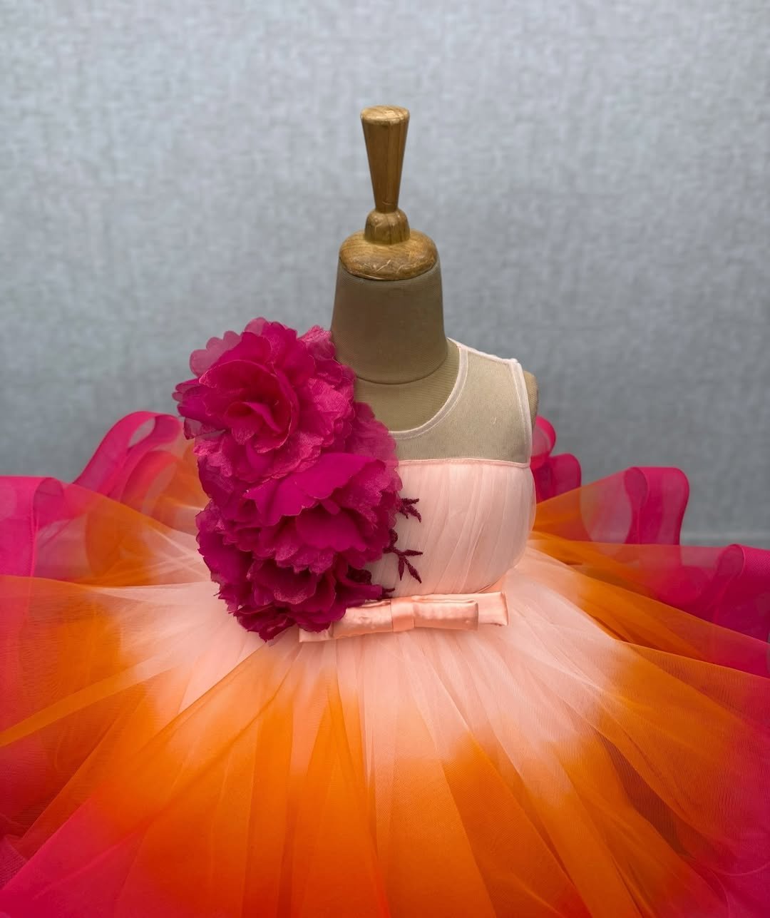 A delightful lilac organza frock featuring charming 3D flower appliqués with subtle pearl centers, voluminous puff sleeves, and a matching bow headband for a truly whimsical look.