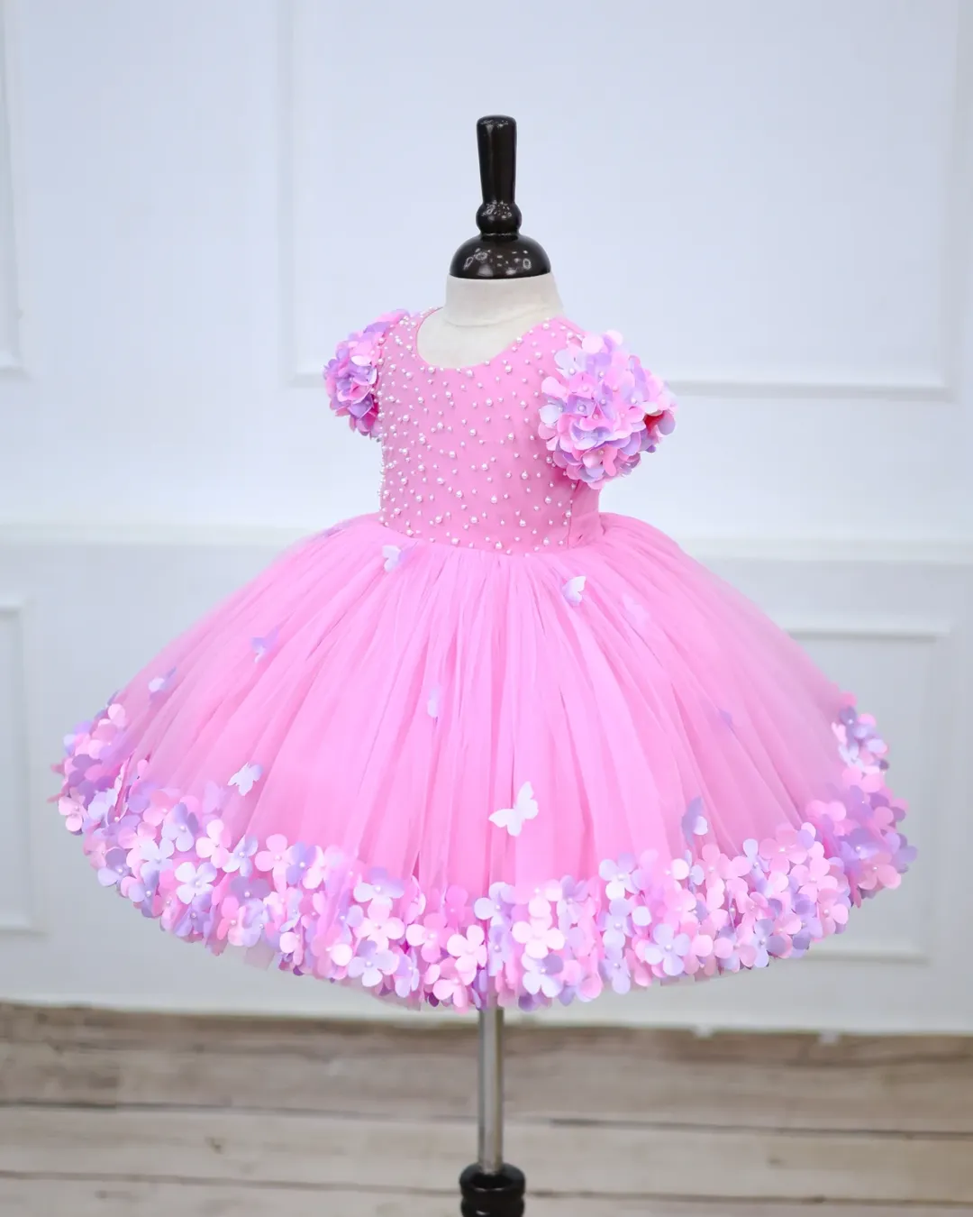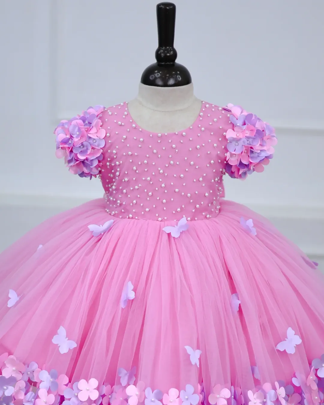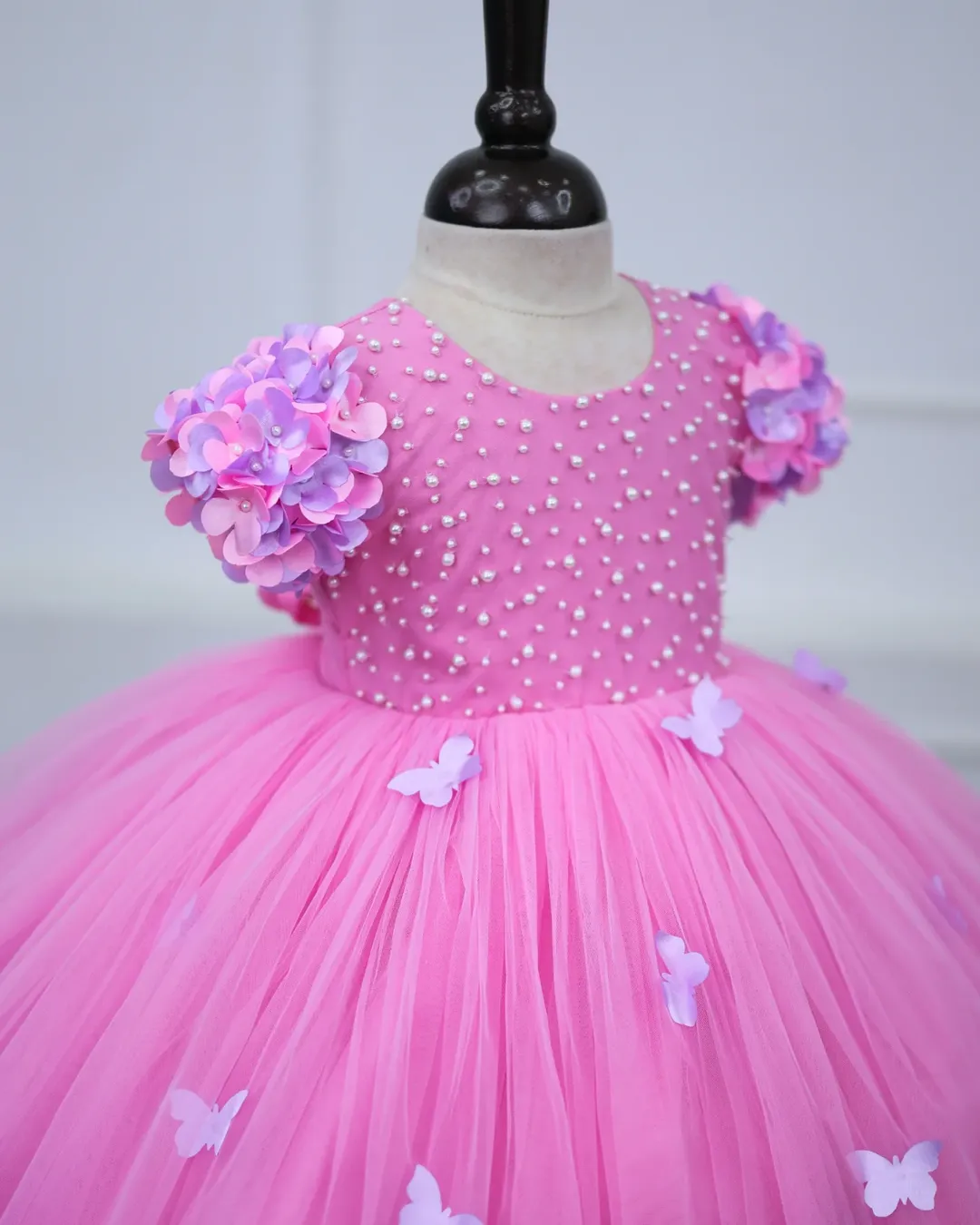 A magical pink tulle frock with scattered pearls, 3D floral sleeves, and beautiful butterfly accents, complete with matching fairy wings.