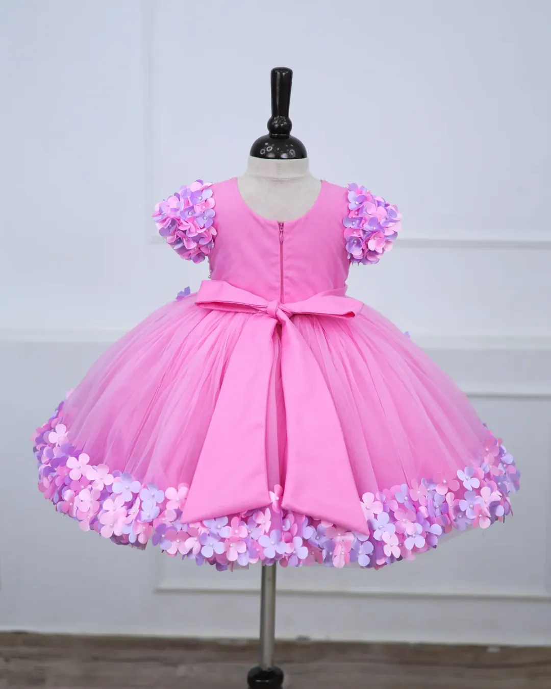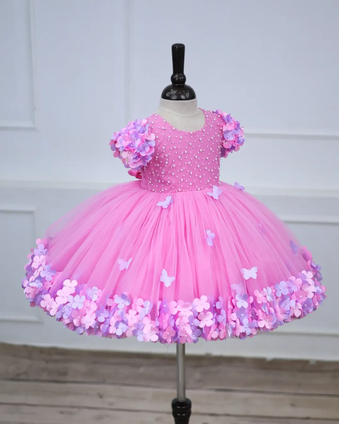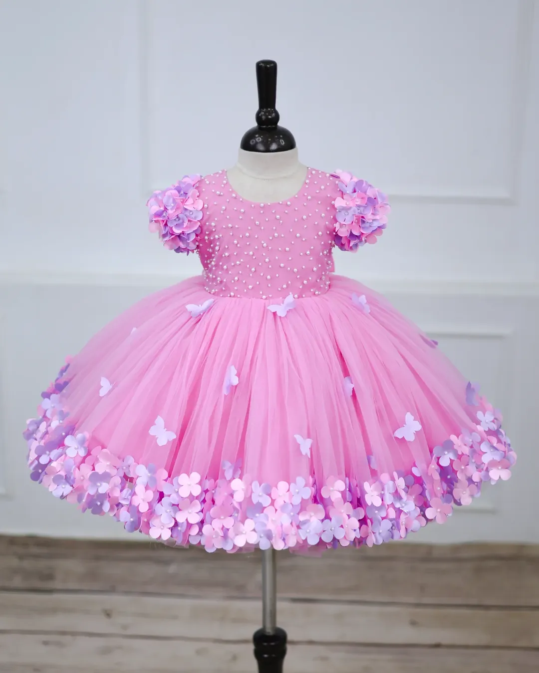 This enchanting pink dress is a dream come true for any little girl. The bodice is delicately scattered with pearls and features sleeves made of beautiful 3D flowers. The voluminous tulle skirt is adorned with lavender and pink butterfly appliqués, creating a whimsical garden feel. To complete the look, it comes with a pair of matching butterfly wings and a bow headband, making it perfect for themed birthdays, photoshoots, or fairy-tale celebrations.