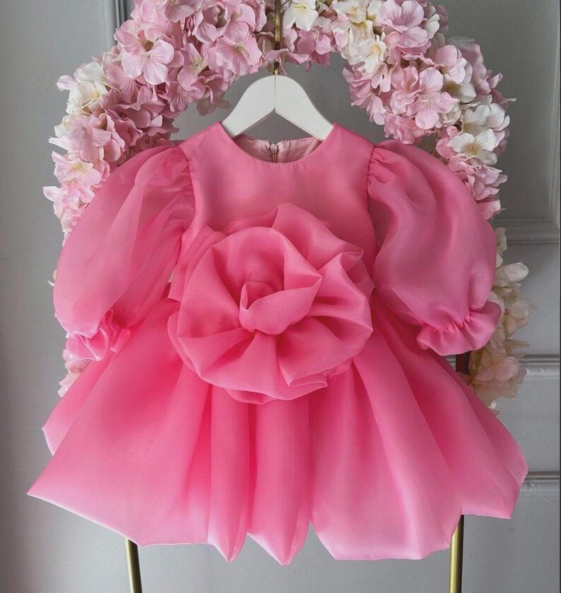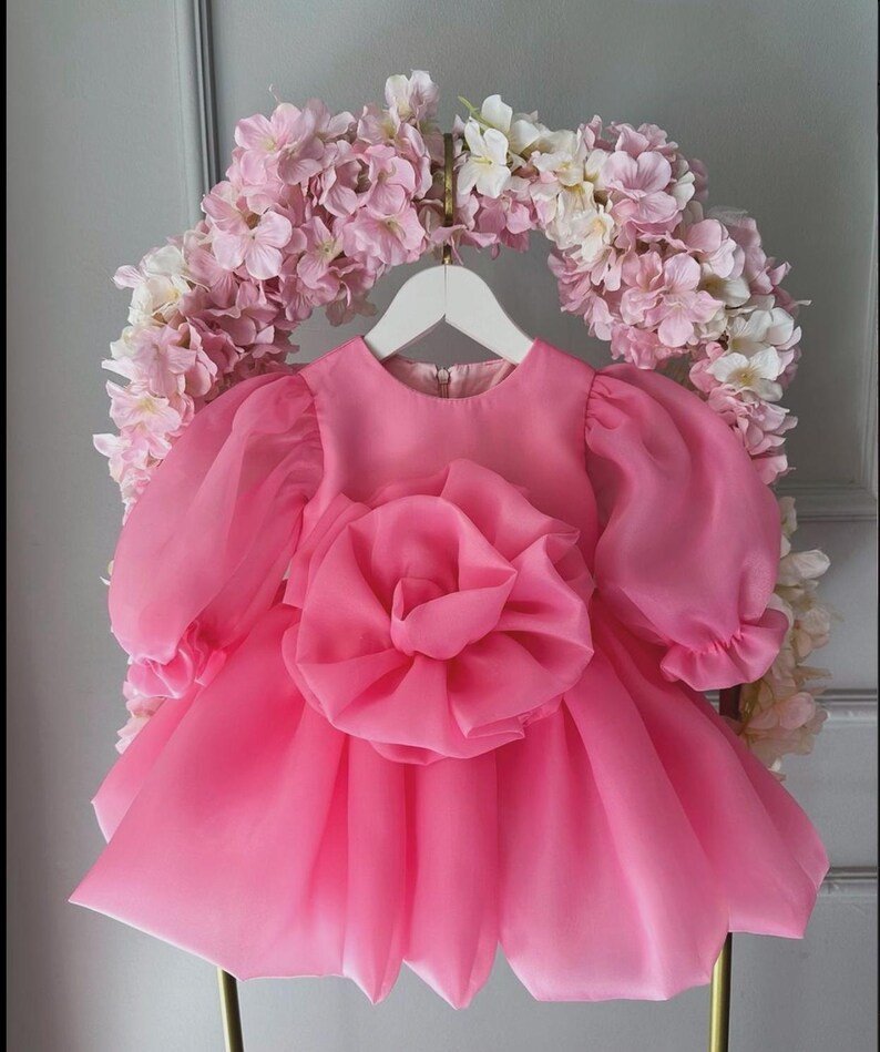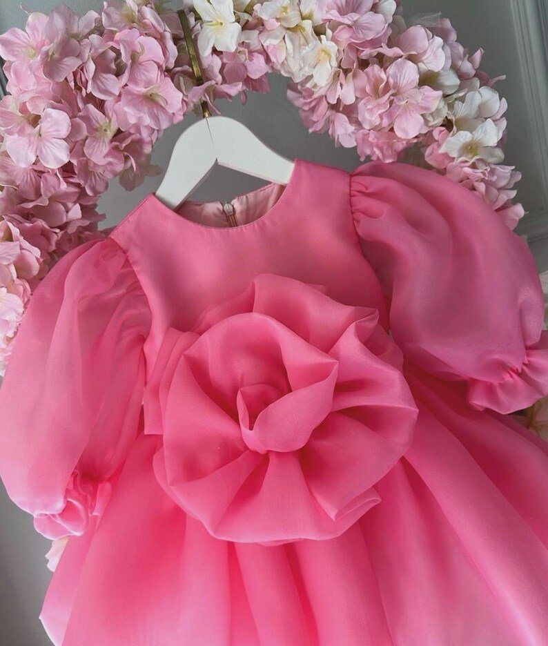 Let her bloom like a rose! This stunning pink dress is made from premium organza with a giant hand-sculpted 3D rose that steals every photo. Sheer long puff sleeves and a super voluminous skirt create pure magic when she moves. Feather-light, breathable and fully cotton-lined for comfort.Includes:
