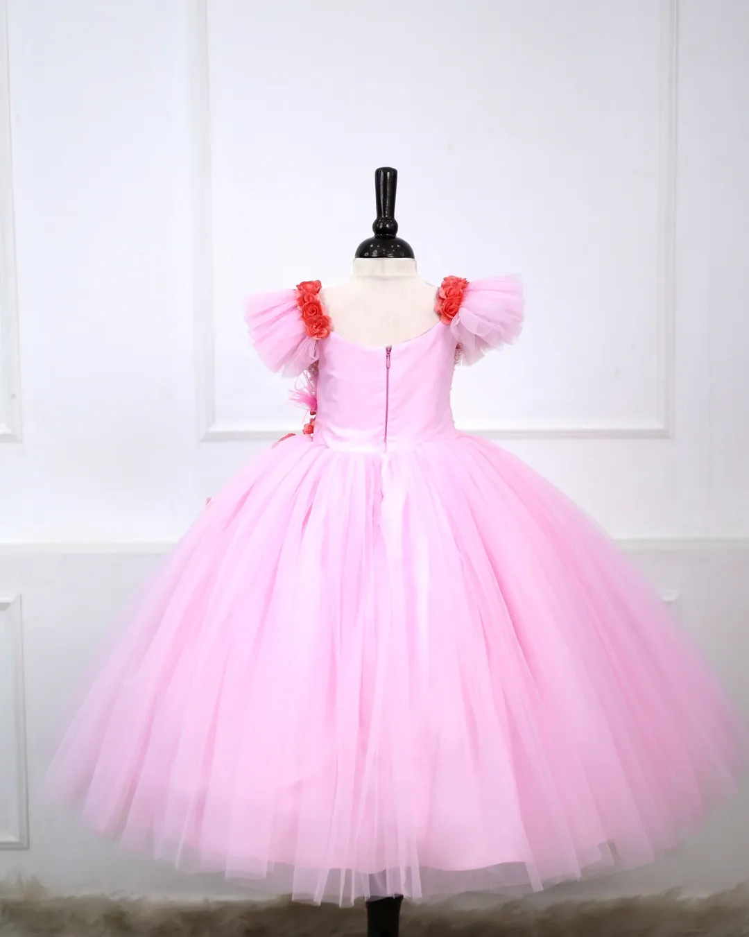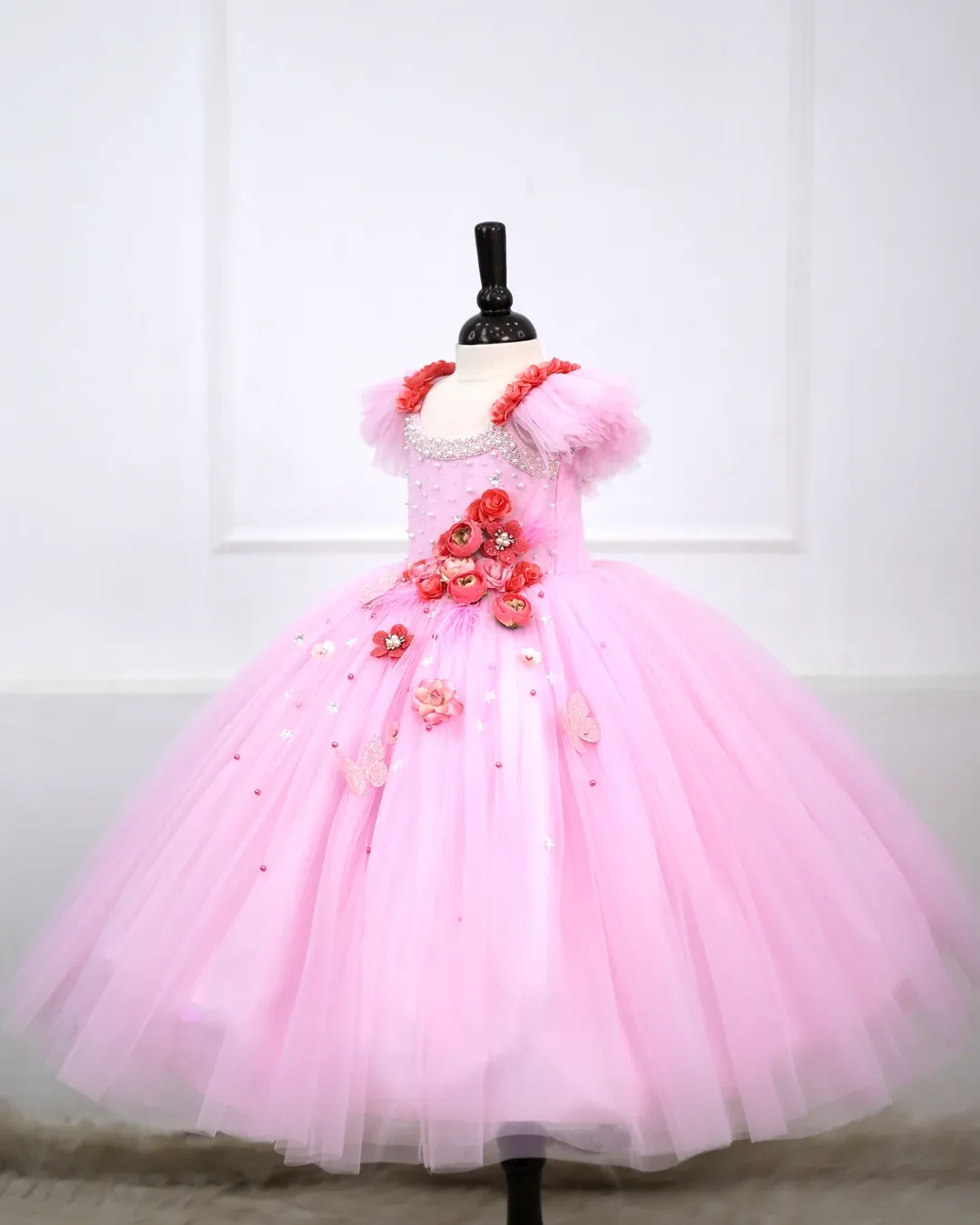 This “Red Rose Bloom” dress is crafted for a truly regal and unforgettable look. The bodice is made from premium red satin and is adorned with three magnificent, handcrafted 3D roses that serve as a bold and elegant centerpiece. The delicate spaghetti straps are beautifully detailed with white pearls for a touch of sophisticated charm. The skirt is uniquely designed with multiple overlapping satin layers that mimic the appearance of blooming rose petals, creating a voluminous and high-fashion silhouette. Perfect for grand birthdays, weddings, and professional photoshoots, this dress will make your little princess the center of attention.