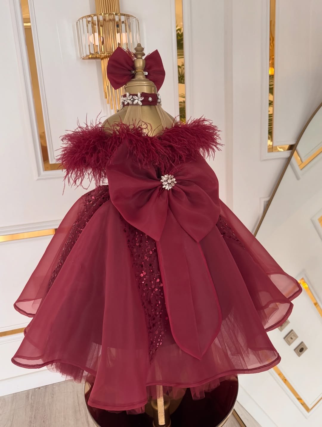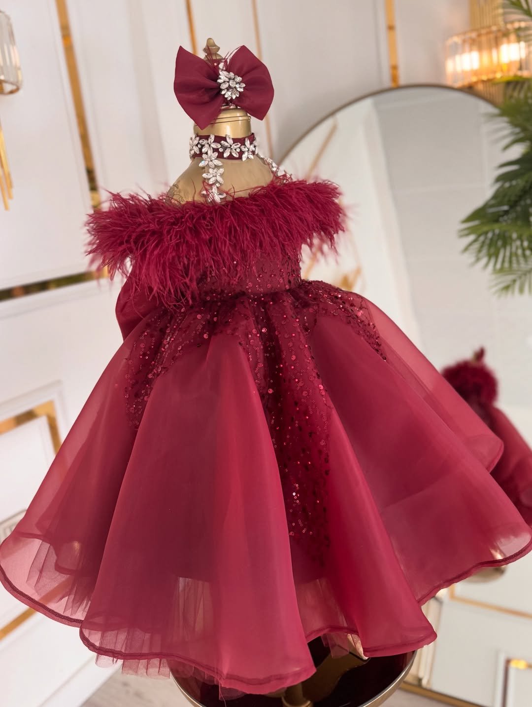 This exquisite gown is a magnificent statement piece, designed to captivate with its rich color and luxurious textures. The combination of dramatic feathers, sparkling sequins, and a full silhouette makes this dress the ultimate choice for a high-end celebration or festive occasion.