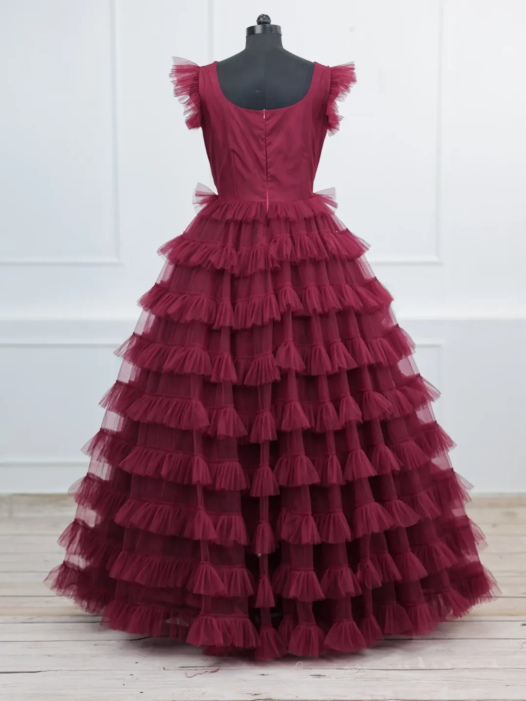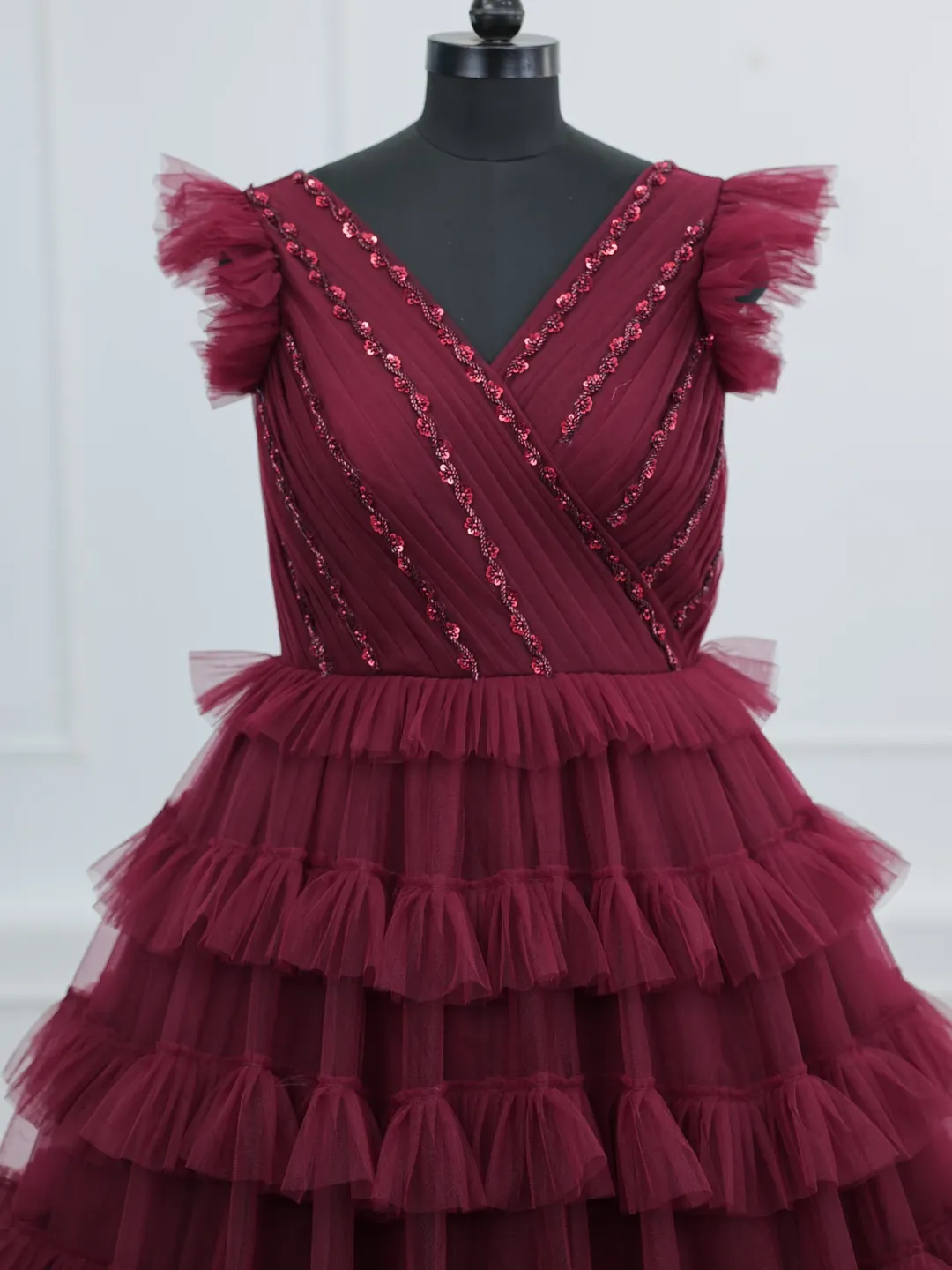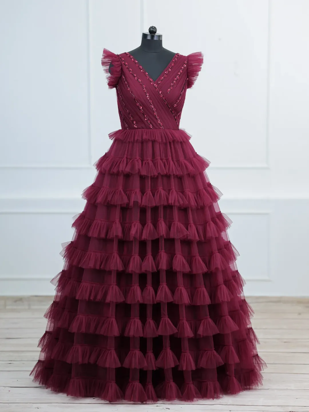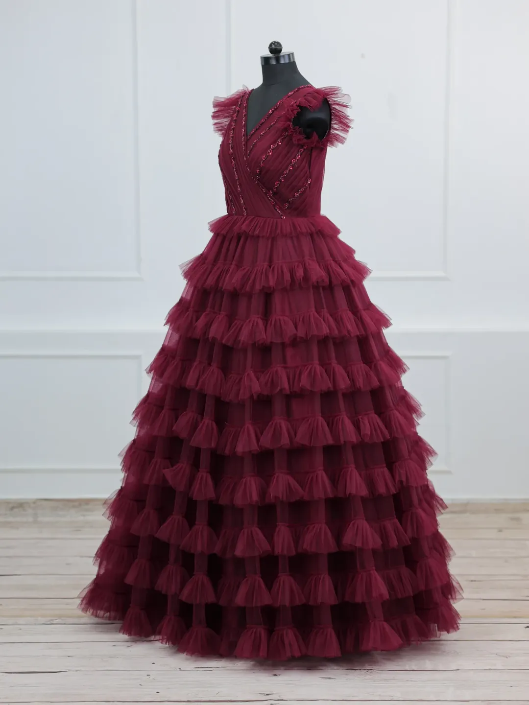 Step into the spotlight with this breathtaking gown, crafted for royalty and grand entrances. The rich wine net fabric creates a voluminous silhouette, defined by countless cascading ruffles that build an unforgettable textured look. The bodice features an elegant cross-over V-neck and delicate ruffle cap sleeves, intricately embellished with subtle sequins and beads for a touch of refined shimmer. With a comfortable structure and luxurious finish, this piece is perfectly suited for gala events, high-end receptions, or formal festive parties, ensuring you command the room with grace and power.