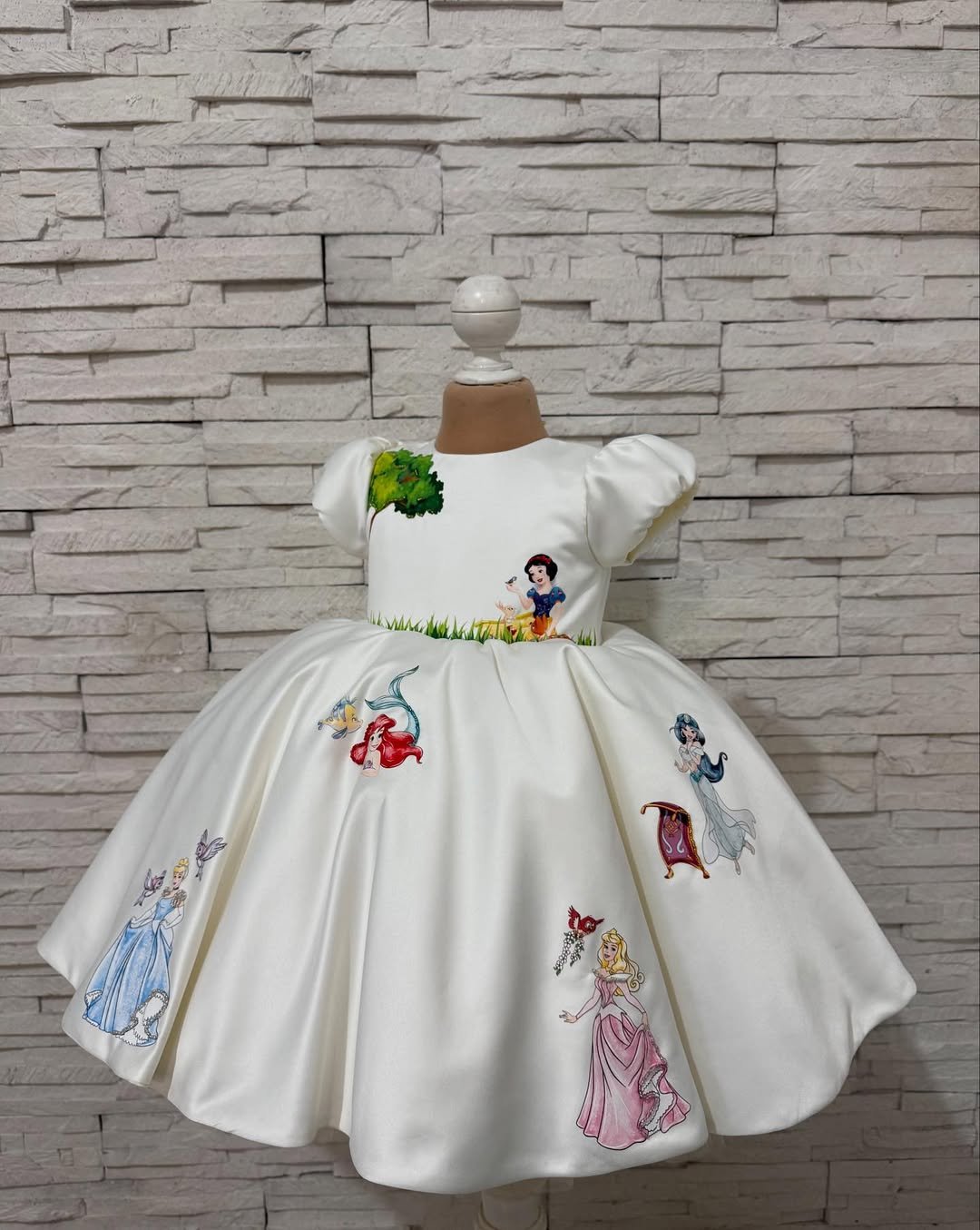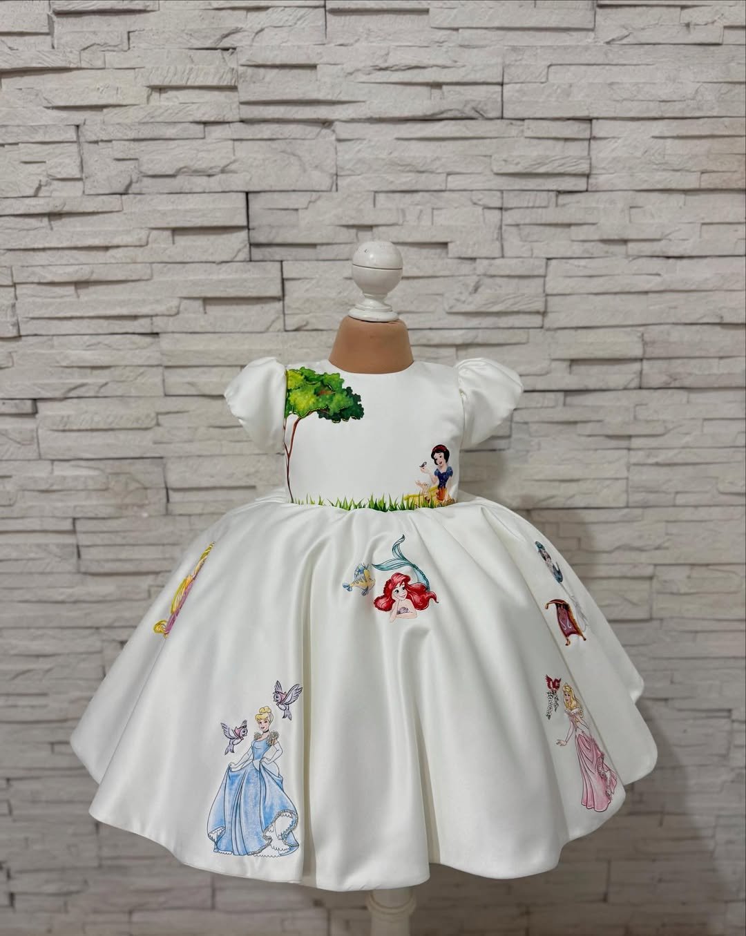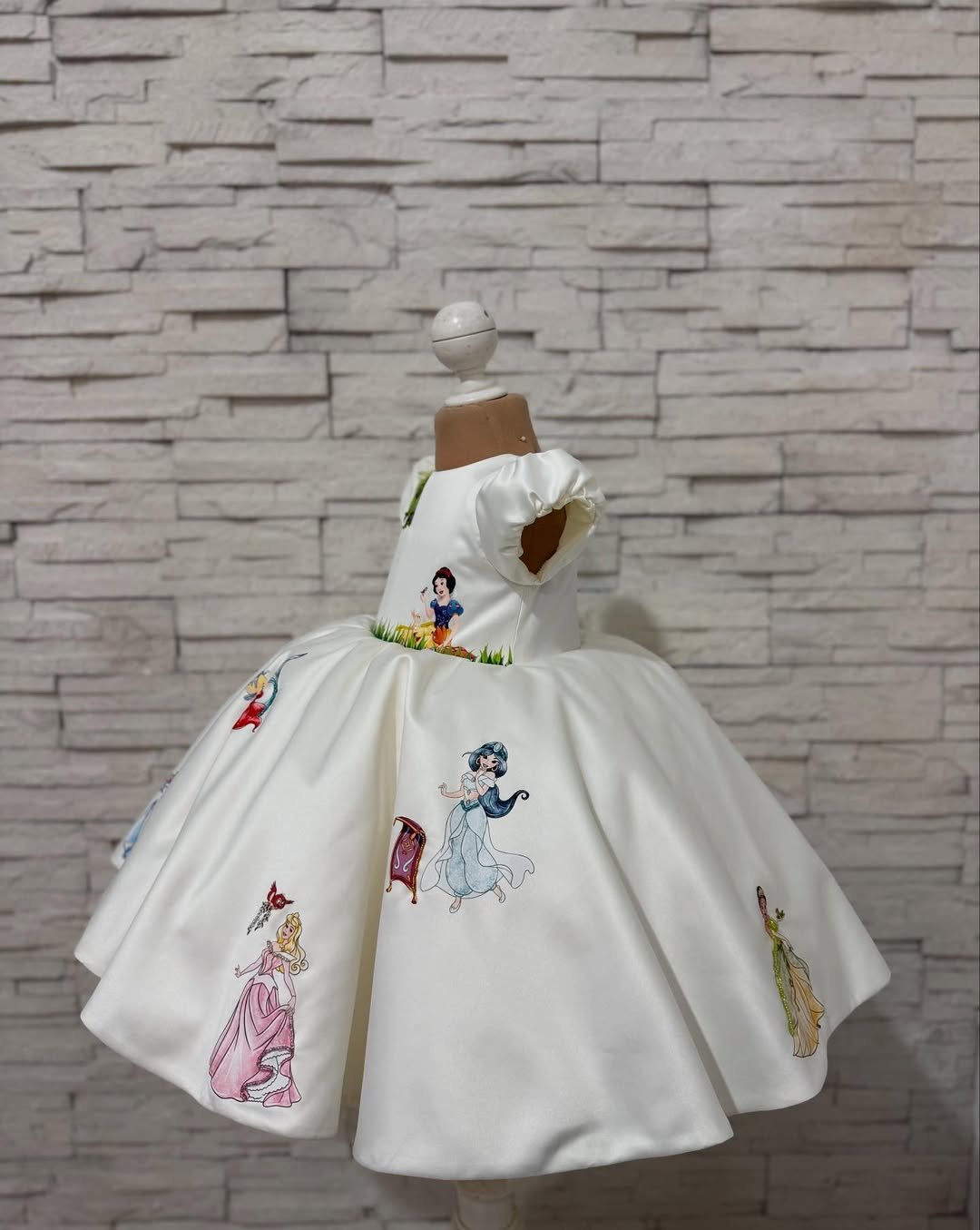 This majestic white gown is a delightful celebration of fairytales, featuring iconic princess characters beautifully printed on the luxurious skirt. The dress’s elegant design and enchanting theme make it a perfect choice for birthdays, theme parties, or any grand occasion.