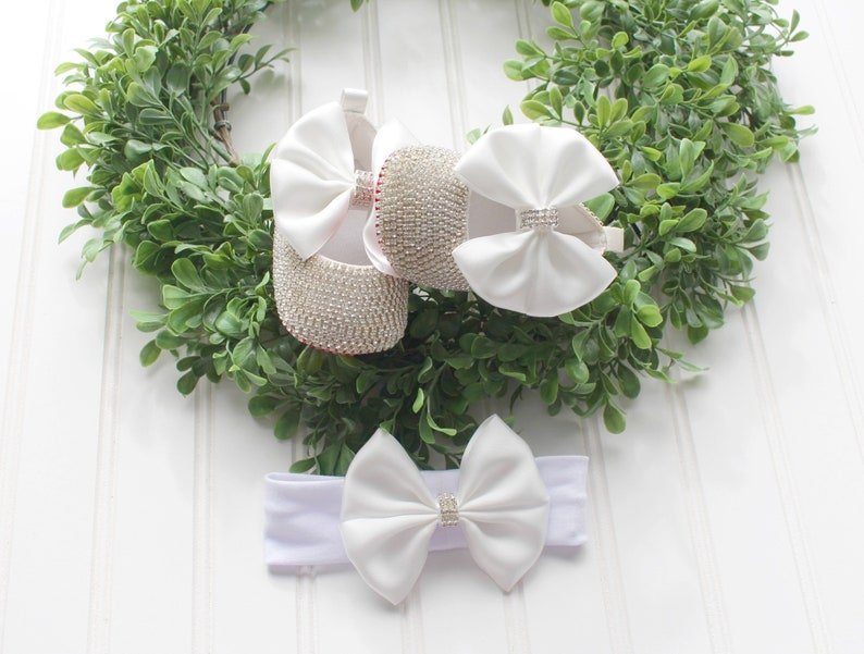 Dazzling white satin baby shoes covered heel-to-toe in brilliant silver rhinestones and topped with an oversized, elegant satin bow.