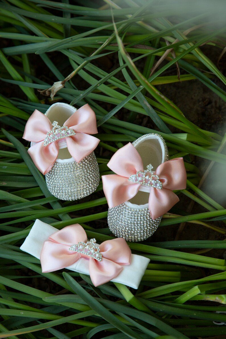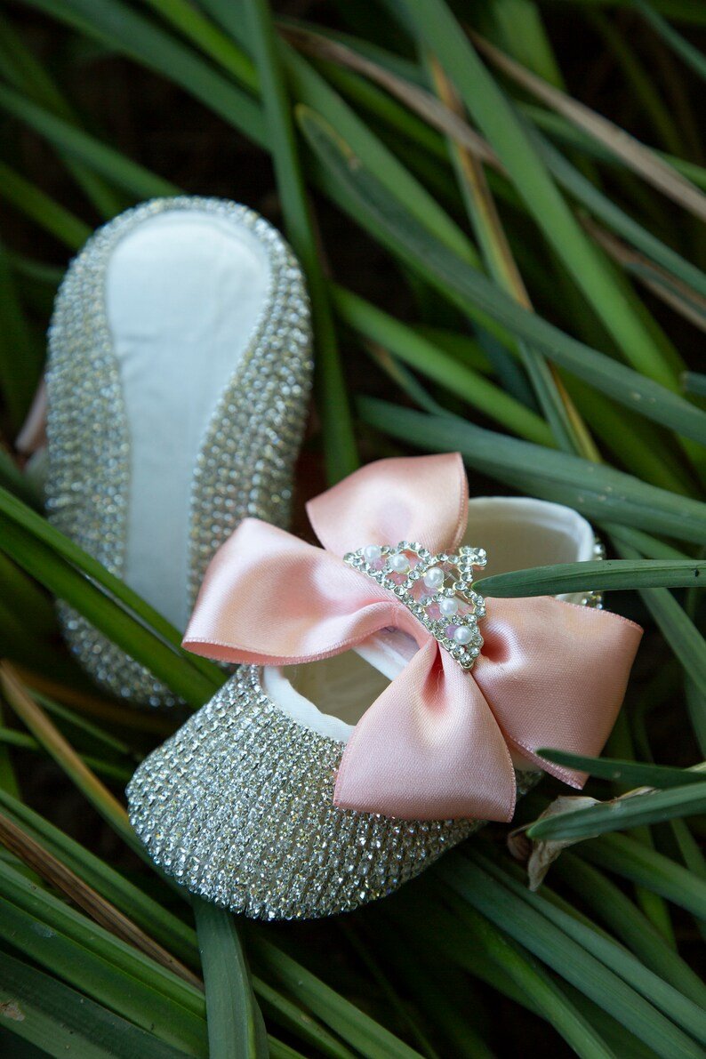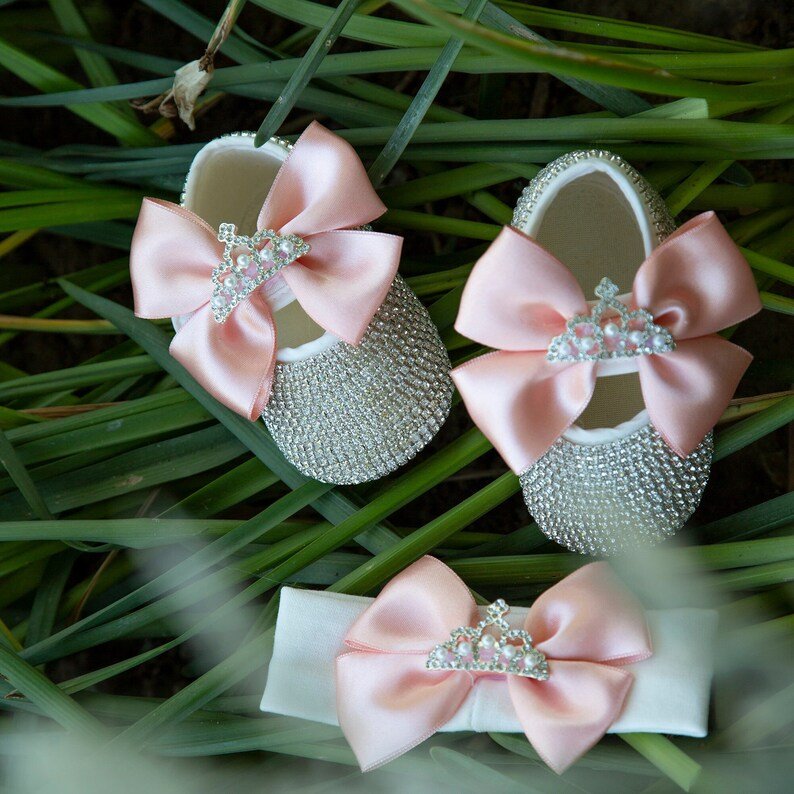 This pair of shoes is a royal attraction for your little one. The entire shoe is adorned with shiny crystals and a beautiful bow design with a regal crown on top. It is perfect for your little princess’s special day.