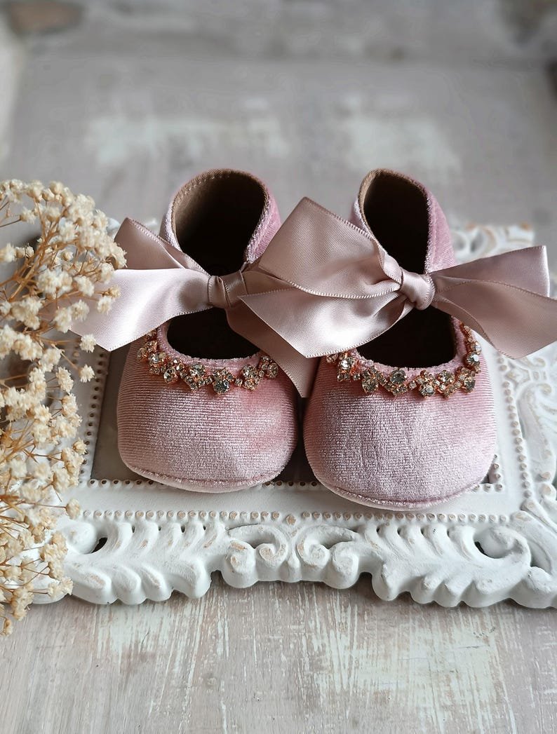 Perfect for life’s most precious occasions, these exquisite soft-sole booties are crafted from a luxuriously soft, plush white velvet. The classic Mary Jane style offers a comfortable, snug fit, while the opening is elegantly trimmed with a sparkling band of tiny crystals for a refined touch. A smooth, white satin ribbon ties gracefully over the foot, ensuring a secure fit and a beautiful finish. With a soft lining for all-day comfort, these charming shoes are an essential accessory for any baby’s Christening, Baptism, or first formal event.