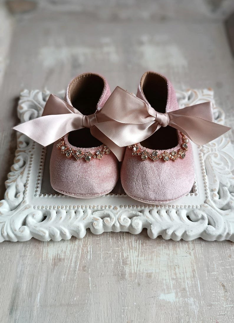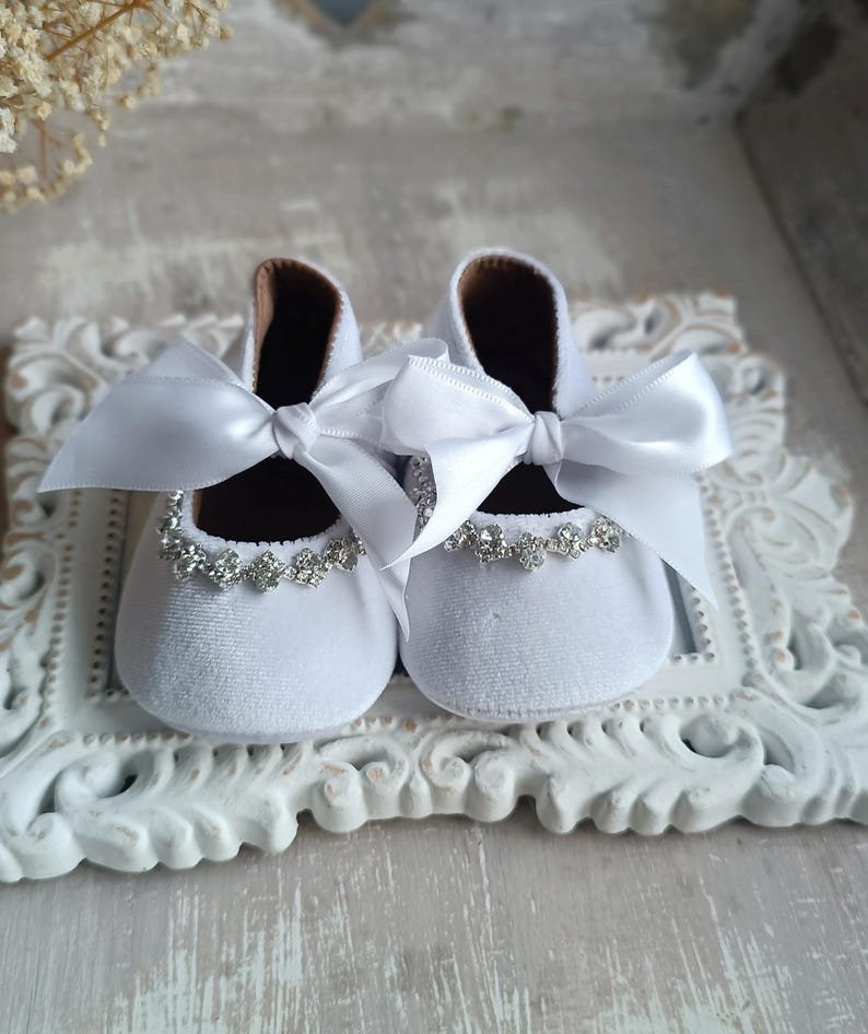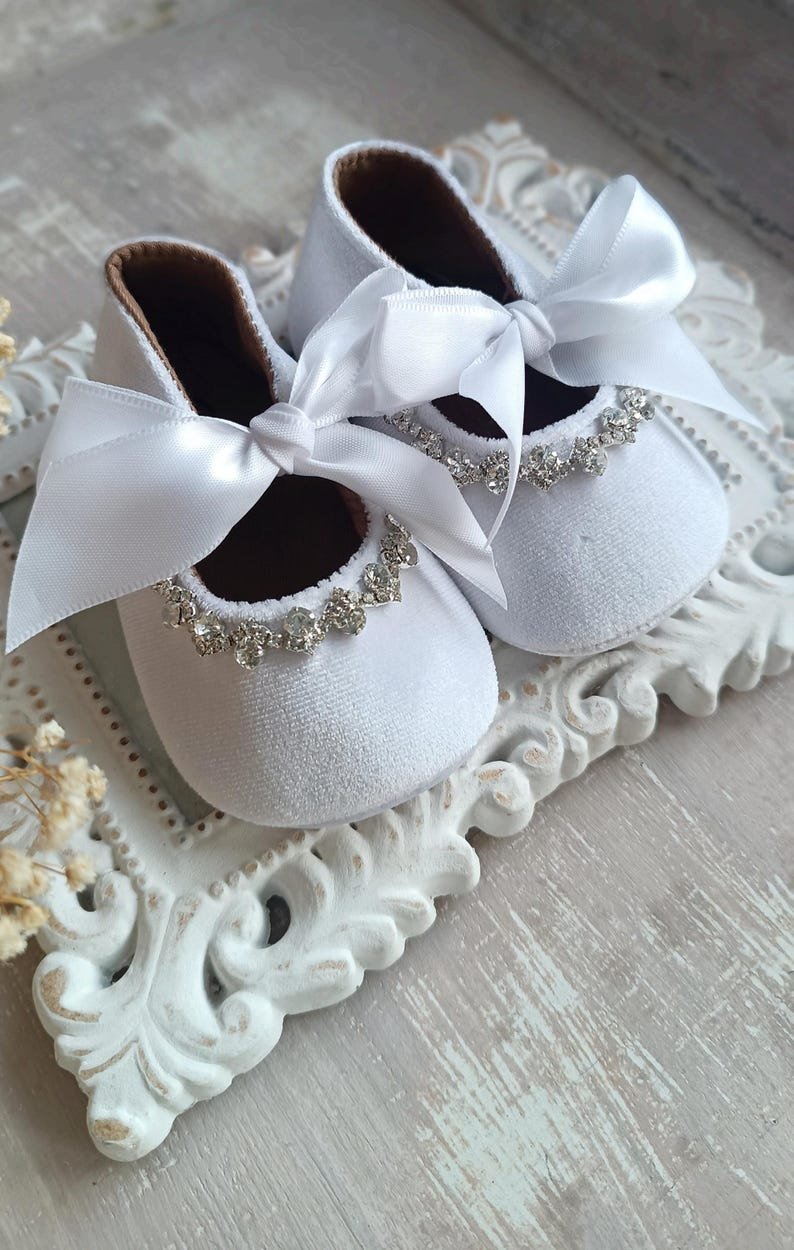 Sweet white velvet Mary Janes featuring a delicate crystal trim across the opening and finished with a classic, tie-up satin ribbon bow.