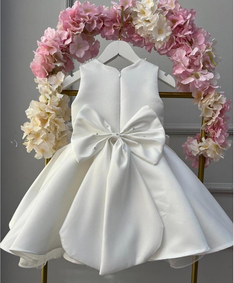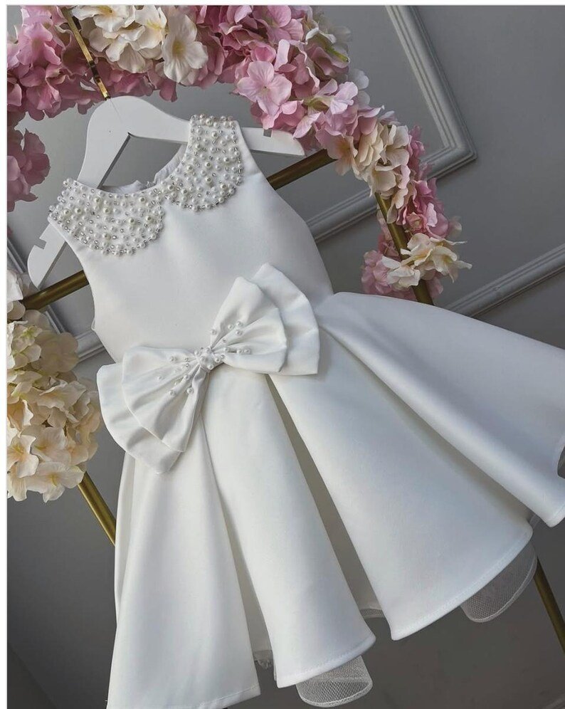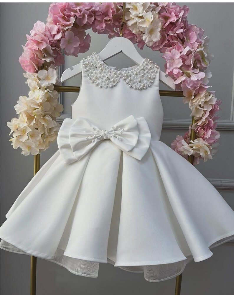 Classic white sleeveless party dress with hand-stitched pearl collar, big satin bow at waist & fluffy tulle skirt. Soft premium satin, fully lined. Comes with FREE matching pearl headband. Perfect for Eid, wedding, birthday. Made-to-measure + pearl shade options.